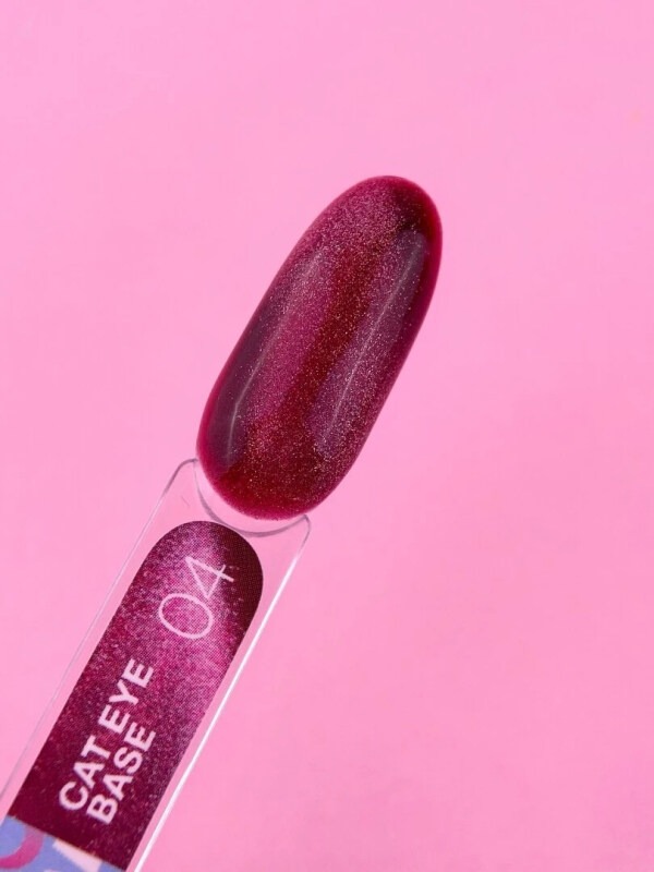 Cat Eye Base №4 — это база с эффектом "кошачьего глаза". В составе продукта содержатся мелкие металлические частицы, которые реагируют на действие магнита, перемещаясь в ещё не полимеризованном слое покрытия, создавая волшебный блик в дизайне.