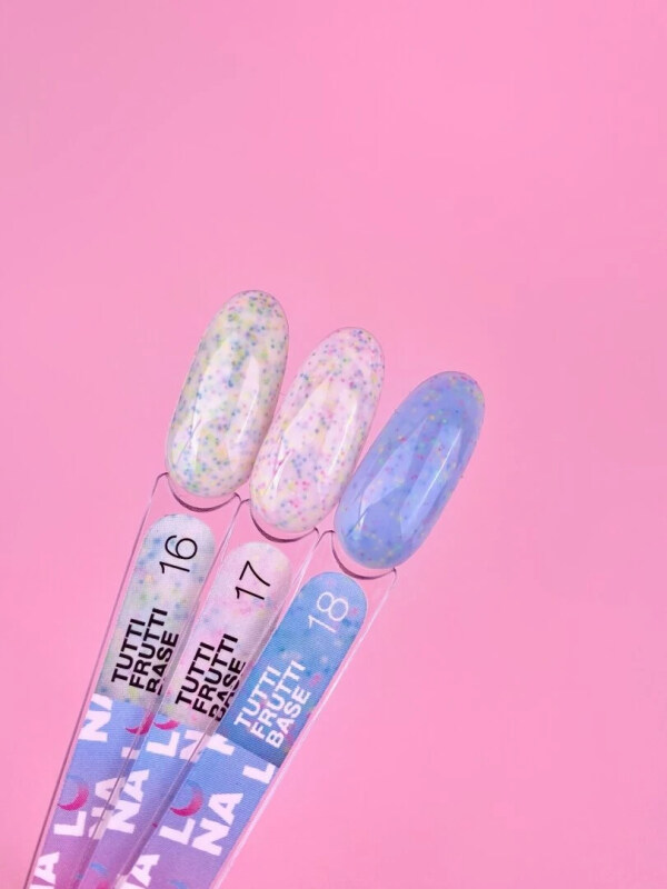 Tutti Frutti Base 17 – это камуфлирующая база с цветными фигурками для покрытия и выравнивания ногтей.