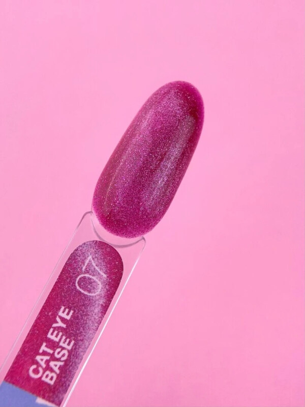 Cat Eye Base №7 — це база з ефектом "котячого ока". У складі продукту містяться дрібні металеві частинки, які реагують на дію магніту, переміщуючись у ще не полімеризованому шарі покриття, створюючи чарівний відблиск у дизайні.
